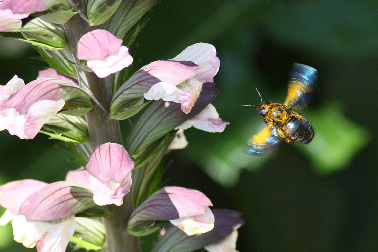 Cet insecte vient tous les jours butiner du matin au soir les fleurs d'acanthe, il y en a au moins 4. Plus gros qu'un bourdon je dirai 3 cm. Photographié dans les Pyrénées Orientales en plaine. Pouvez vous l'identifier ? Merci pour vos infos.