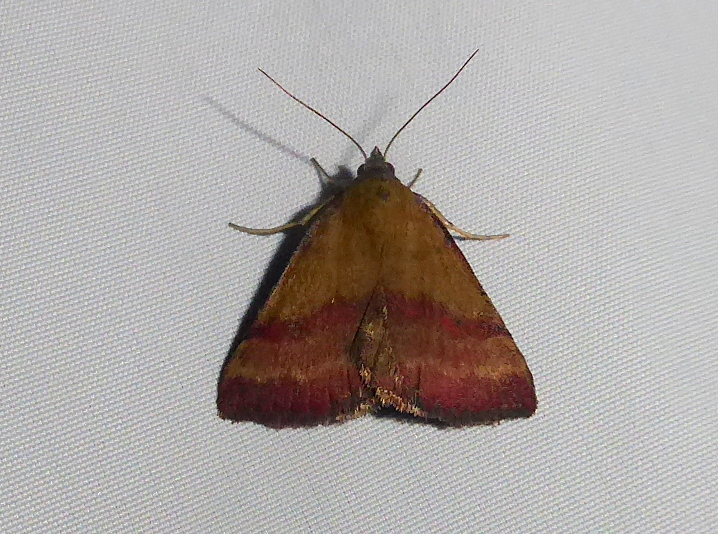 J'hésite entre une géomètre qui saigne (L.c.) ou un Crambidae qui saigne aussi, car la forme des bandes magenta me perturbe, bien que les espèces auxquelles je pense soient variables... ce sera donc à confirmer.