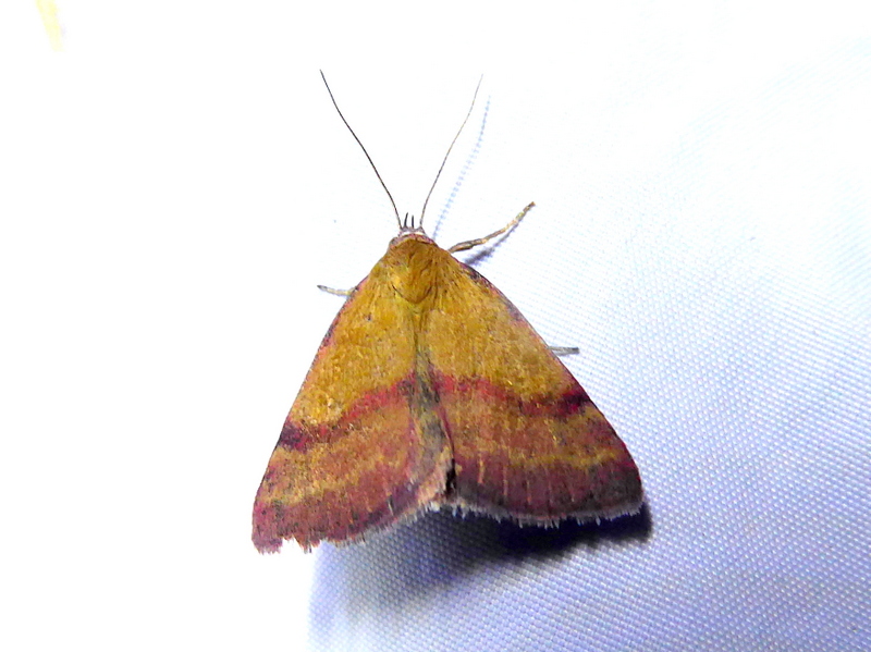 J'ai oublié la taille, mais environ la même que Evergestis limbata. Un peu plus grand que Pyrausta sanguinalis.