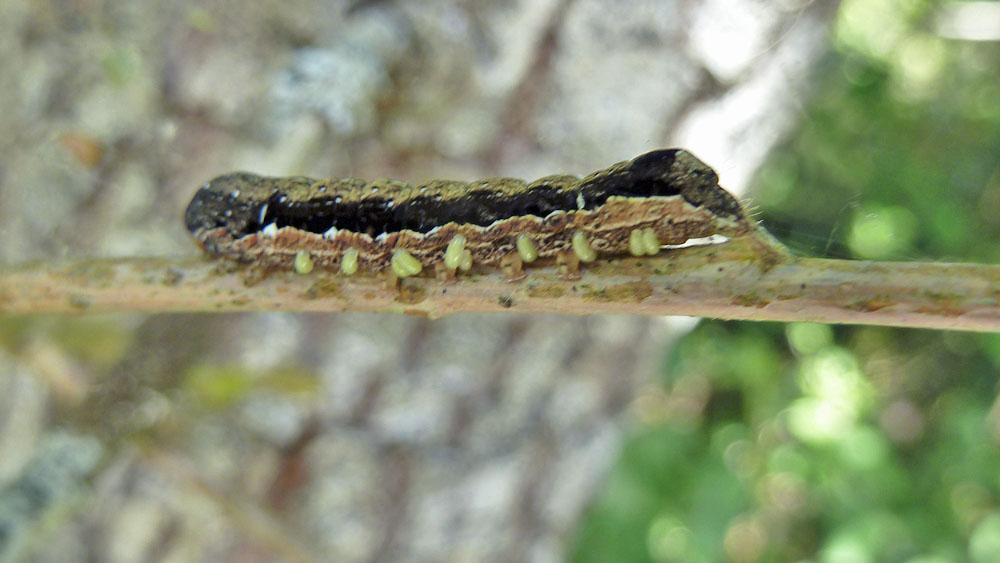 Pas des œufs, plutôt des larves qui sont sorties de la chenille (son tégument est déchiré par endroits). Peut-être des hyménoptères de la famille des Braconidae.