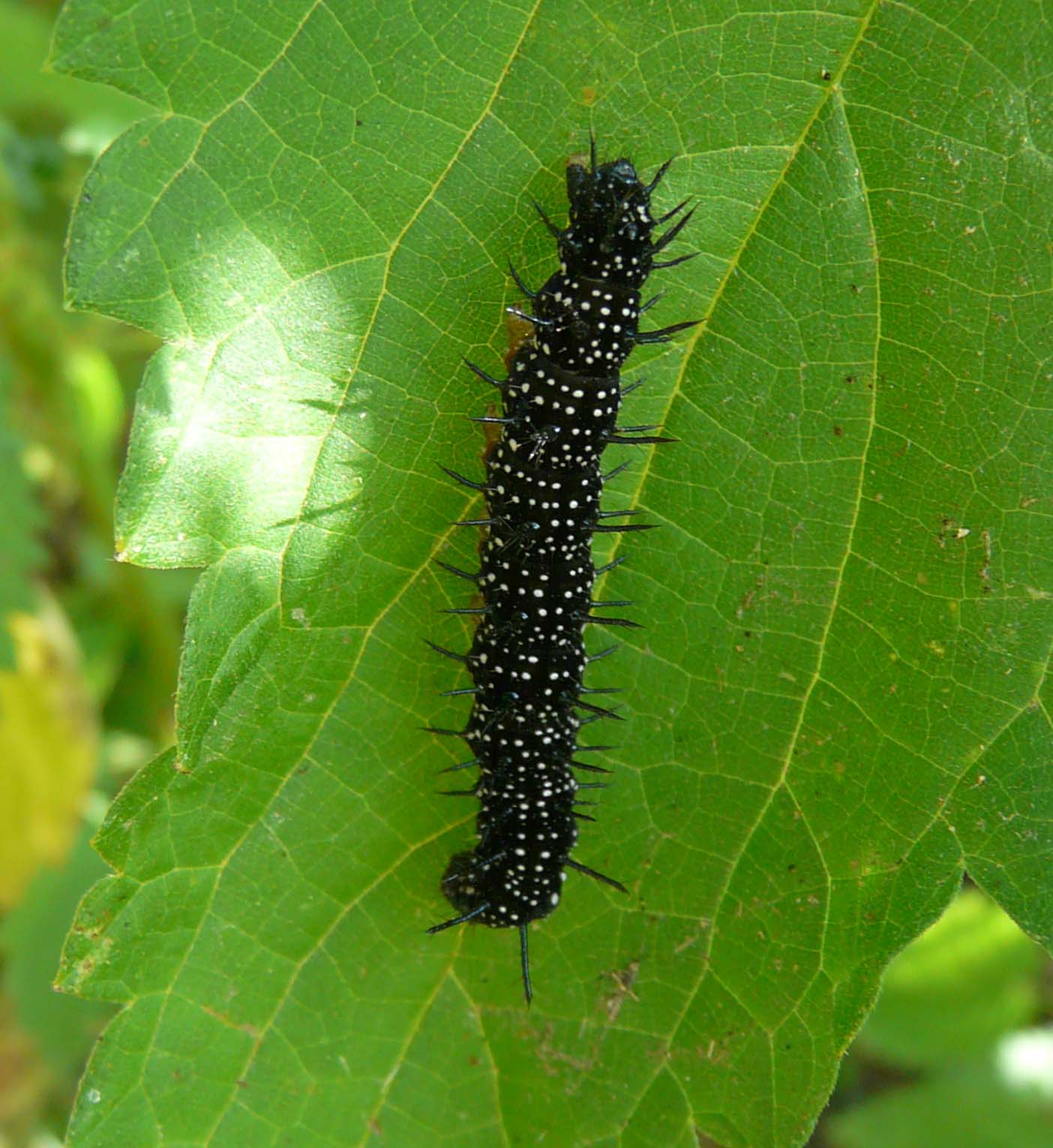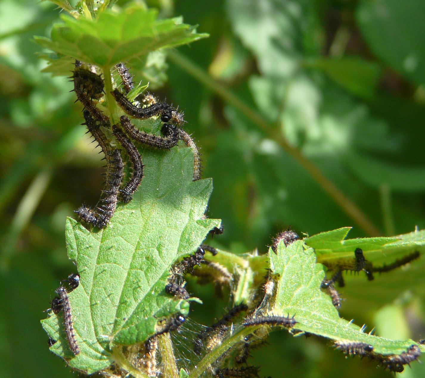 Si tu en a vu des plus jeunes, cela peut être pas mal de vérifier que c'est bien la même espèce. Les jeunes chenilles de cartes géographiques peuvent faire penser aux paons du jour, notamment dans les premiers stades où les cornes de la tête ne sont pas très visibles.