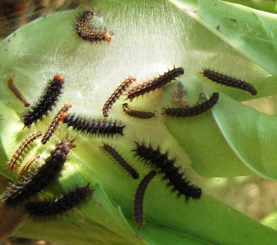 Je n'arrive pas toujours à suivre jusqu'au bout les élevages en plein nature. Quelquefois ils partent tous, même très jeunes. J'ai un nid de Cinxia, chenilles noirs, qui restent ensemble dans leur fille de soie très long, et un autre nid dont les chenilles sont parties jeunes et elles sont maintenant toutes quelquepart dans l'herbe. Il faut que je fasse attention où je marche