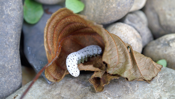On voit que cette larve a au moins 6 paires de fausses pattes, ce qui exclue les chenilles de lépidos qui n'en ont jamais plus que 5.
