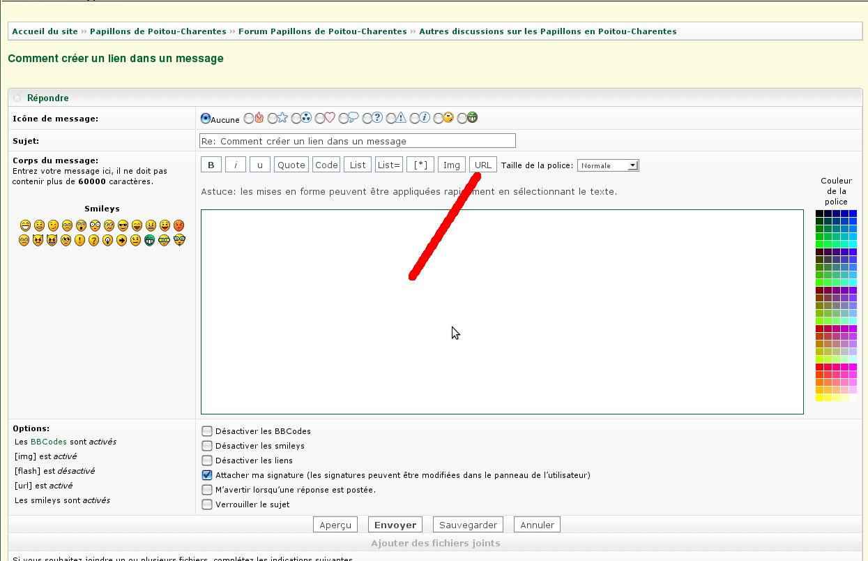 On clique sur la balise URL du petit éditeur de texte, on met le texte qui envoie vers le site internet en question entre les balises et le petit truc c'est de mettre l'adresse du site internet précédée d'un "="après "URL" comme ceci : [ url=http://www.papillon-poitou-charentes.org/ ]Les Papillons du Poitou-Charentes[ /url ], ceci nous donnera Les papillons du Poitou-Charentes