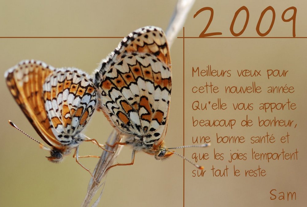 Merci à celles et ceux qui contribuent à faire fonctionner le forum soit par le post de photos, l'apport de conseils ou l'aide à la détermination. Espérons qu'en 2009 beaucoup nous rejoignent pour parler de nos amis les papillons