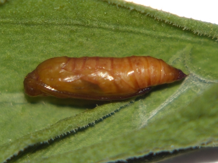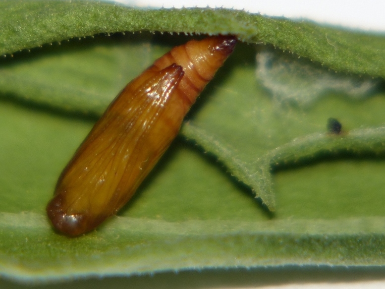 Elle en grandira plus : elle ne se nourrit plus et elle a commencé à tisser un cocon sous une feuille.