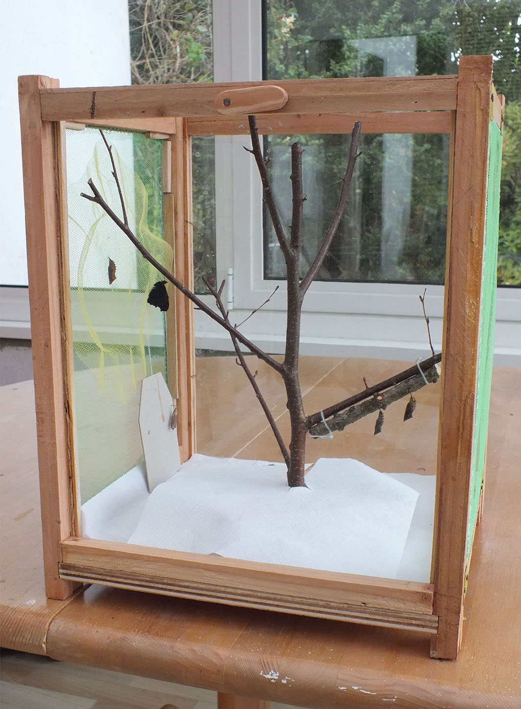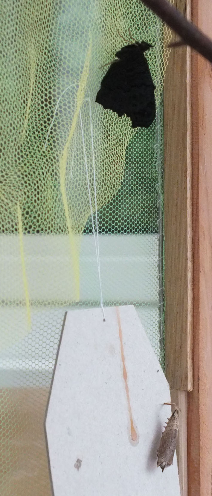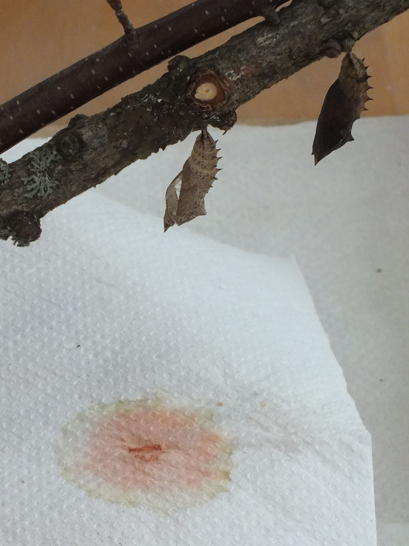 Ensuite, dans la volière une chrysalide a coulé. Accroché au bord de la tulle. Première erreur : une mouche a pu pondre sur la chrysalide.