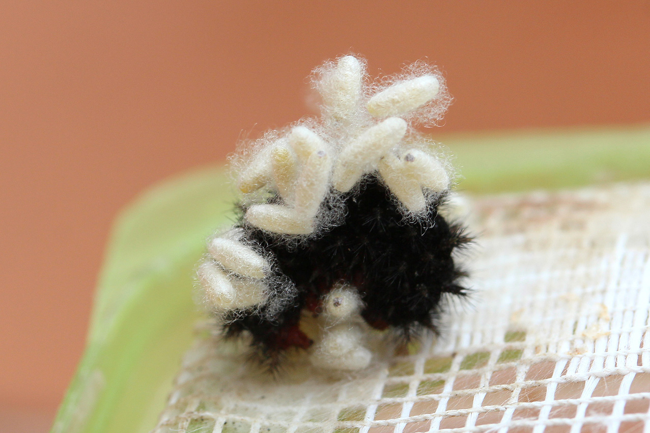 Les mouches avaient sans doute pondu dans les chenilles avant leur capture... les larves se développent à l'intérieur des chenilles ou des nymphes et les dévorent par l'intérieur... beurk !
