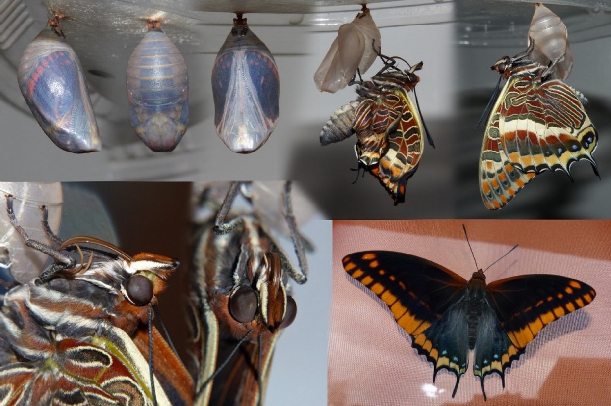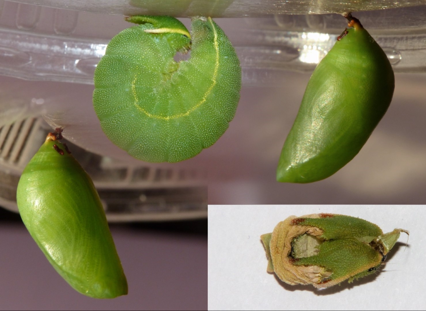 La chrysalide est superbe. Elle va changer de couleur et devenir transparente pour laisser voir les couleurs. Attention : éclosion en moins d'une minute (je me suis fait surprendre plusieurs années de suite). Déploiement des ailes en 30 mn, 4 heures avant l'envol.