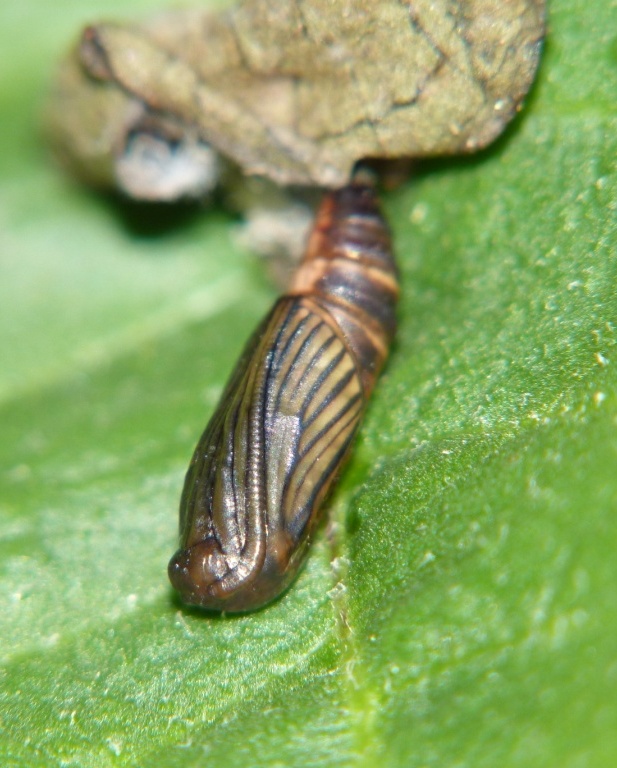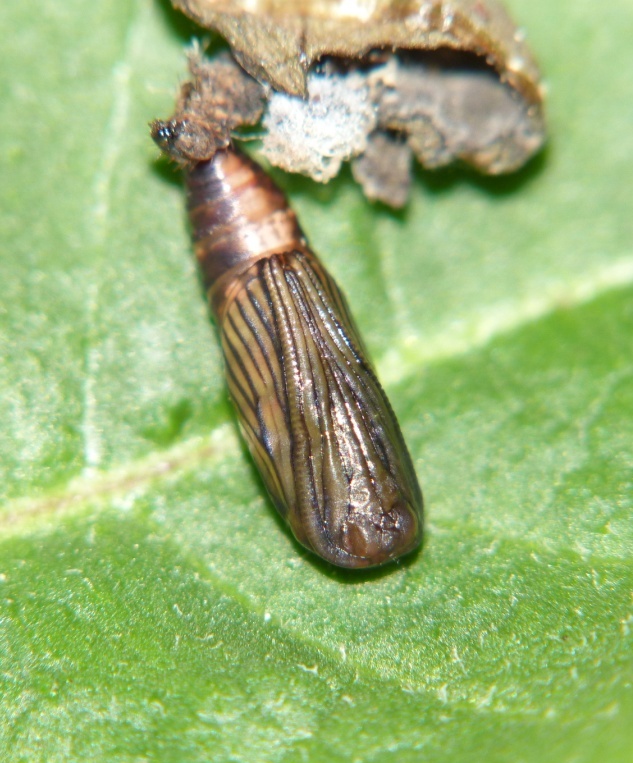 Enfin la première chrysalide pour ces deux dernières chenilles aujourd'hui... Les pauvres chenilles ont bien du mal chez moi avec les mauvaises conditions météo de cette année.