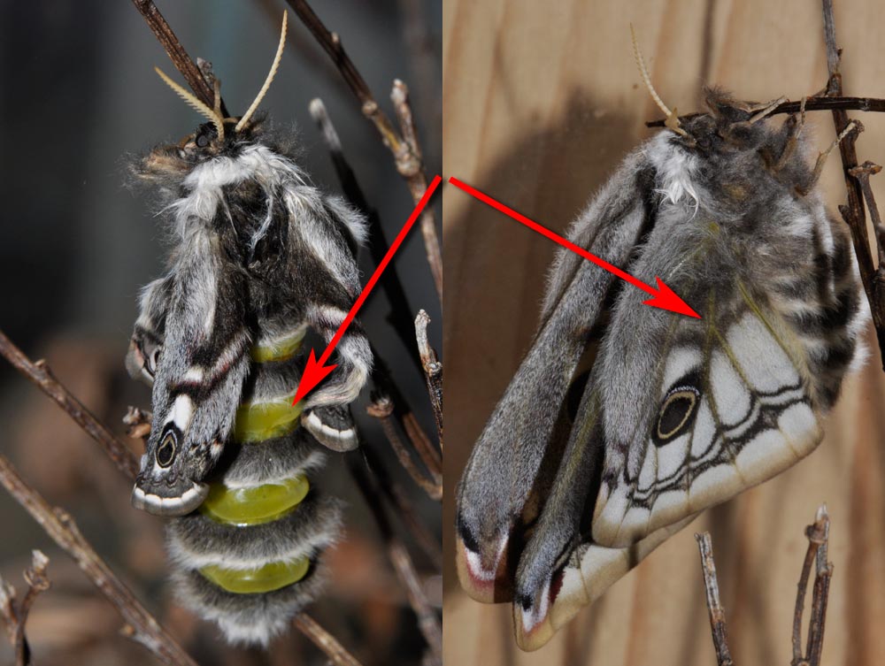 Lorsque le papillon déploie ses ailes, l'abdomen se rétracte et on aperçoit ce liquide en transparence dans les principales nervures des ailes qui sont alors teintées de jaune...