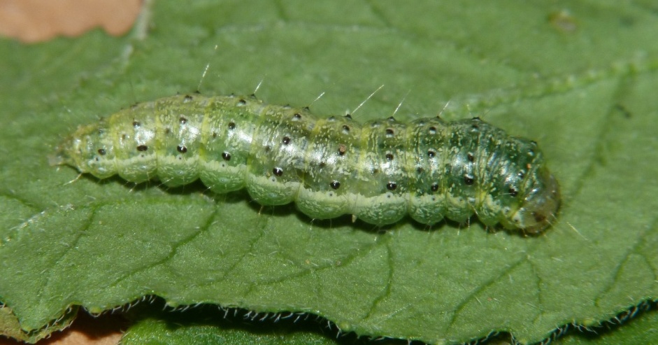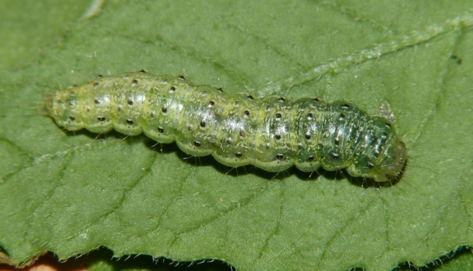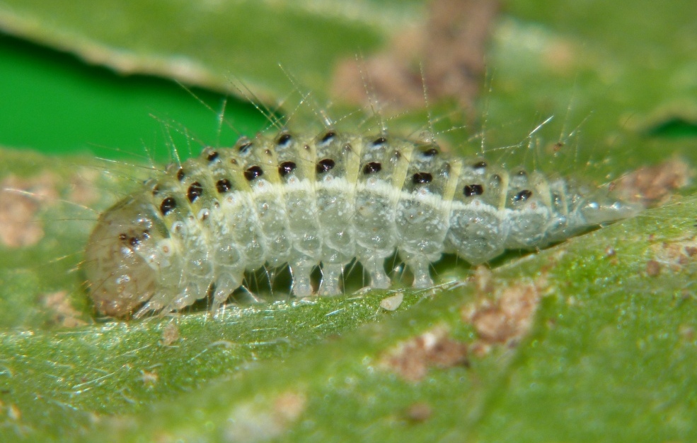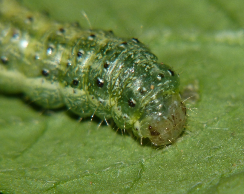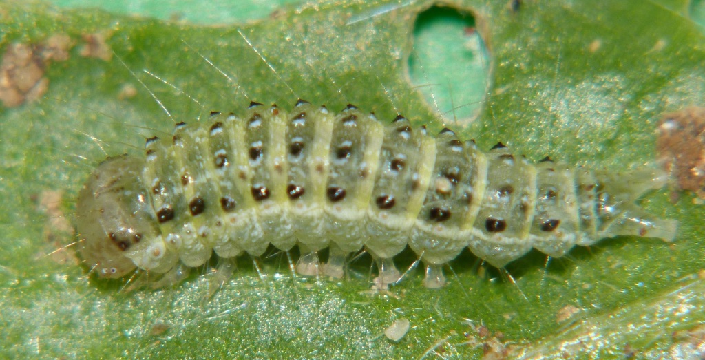 La chenille est tellement petite que je n'ai pas osé déroulé le nid qu'elle s'est fait avec la feuille, donc je ne sais pas si la chrysalide est formée ou pas...