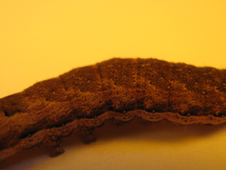 Ça n'aura pas traîné : samedi soir, Juliette (petite soeur de Clara) est revenue avec une chenille sous le bras, trouvée roulée en boule sur un grillage dans le square en bas de chez nous. Un peu maigre en matière de plante-hôte, mais je crois qu'il y a un buddleia à proximité; je peux passer voir ce soir si c'est nécessaire à l'identification. Car voilà la question : je n'ai pas eu le temps de fouiner sur internet ni dans mon guide pour débutants, et je suis donc bien incapable d'identifier une chenille aussi peu "remarquable". Nous avons compté cinq fausses pattes, et elle mange actuellement de la salade, seul aliment que nous avions à lui proposer (mais peut-être n'est-ce pas l'idéal ?). Elle est peu active pour l'instant.