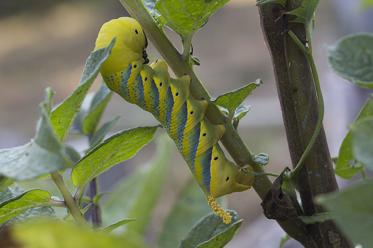 Sans vouloir concurrencer Jo, un beau rêve est en route. Ce matin tôt, au jardin, sur un minuscule carré de 12 plants de pommes de terre (oui mais des Vitelotte, svp!), cette chenille m'attendait. Combien de fois suis-je passé sans la voir? Mystère, je vais au jardin tous les jours.