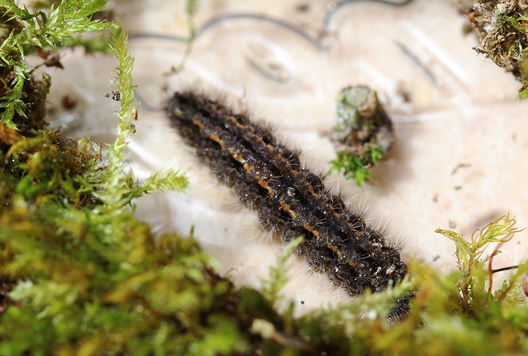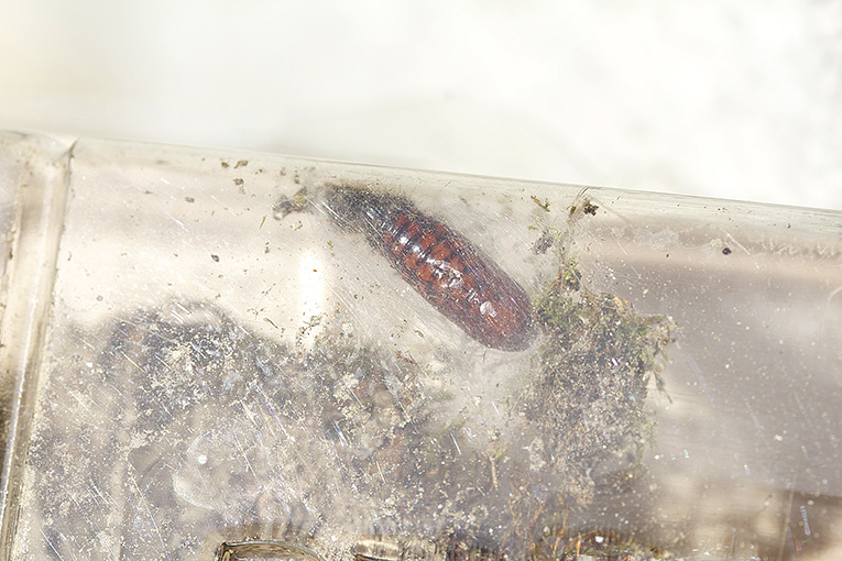 J'avais conservé cette chenille qu'à première vue j'avais prise pour Cryphia raptricula. Erreur reconnue, je pense que c'est Eilema caniola. Elle a tissée une loge et commence à se nymphoser. Elle s'est nourrie quelque jours avec de la mousse de pierre.