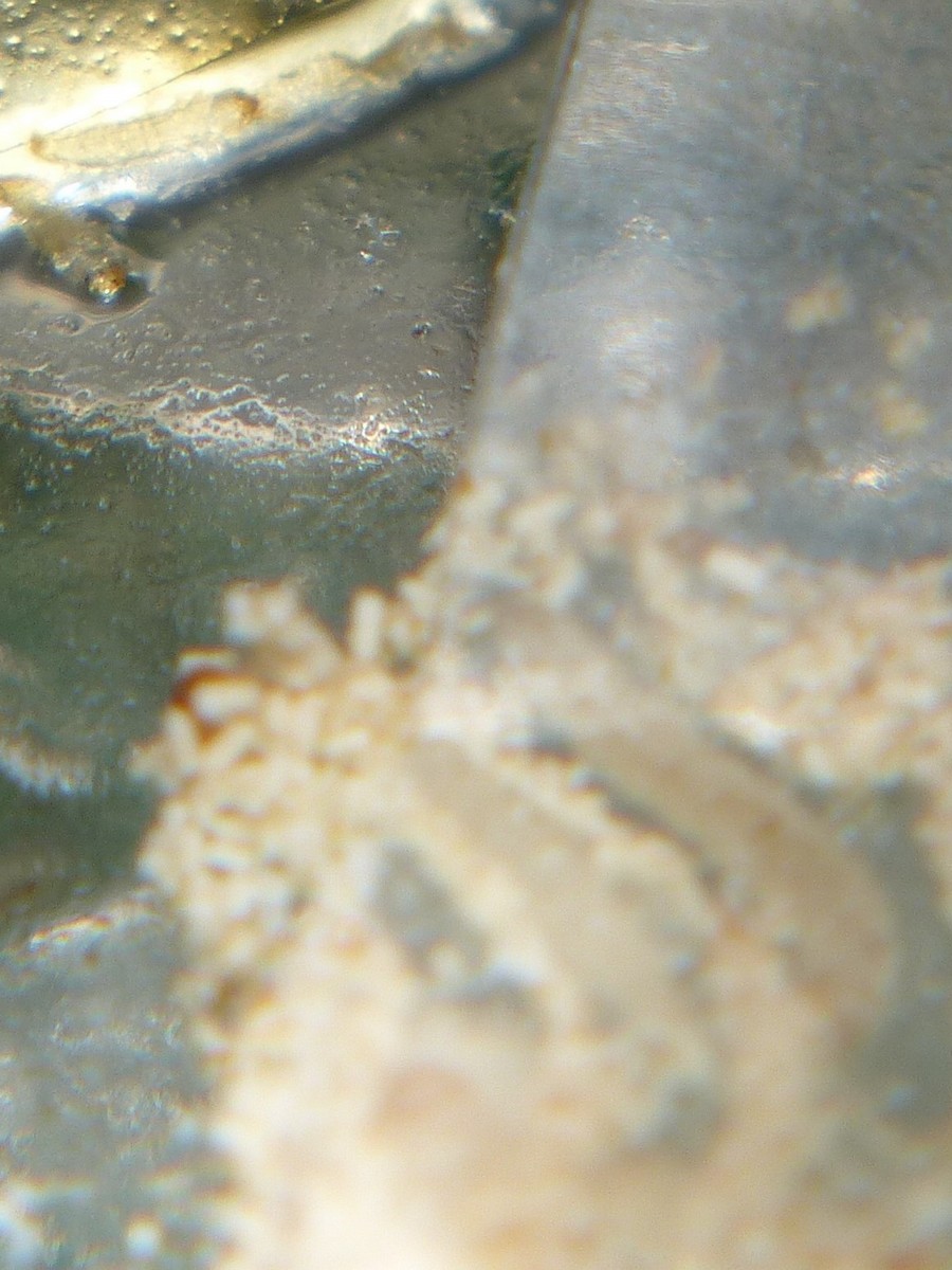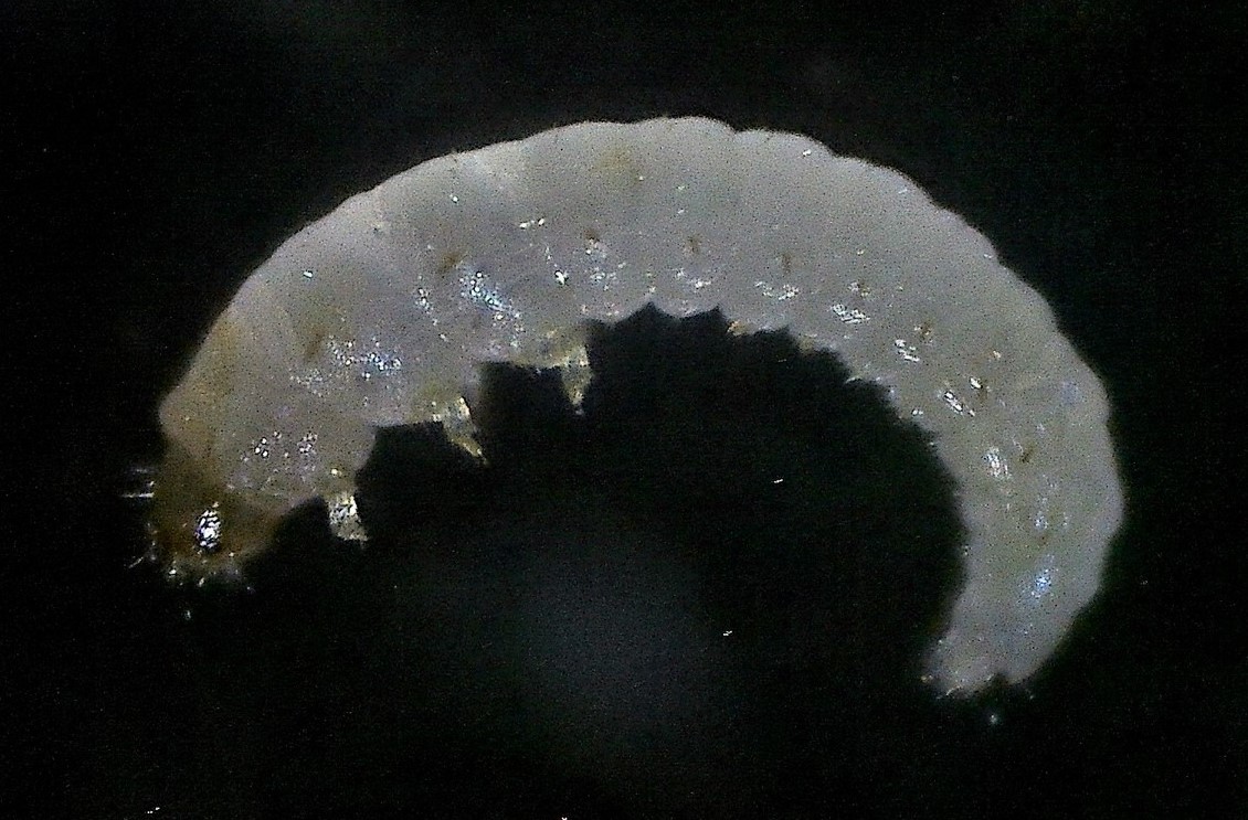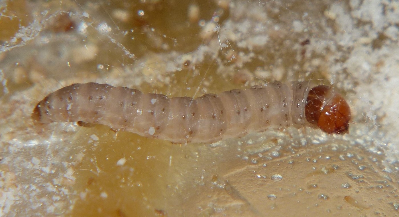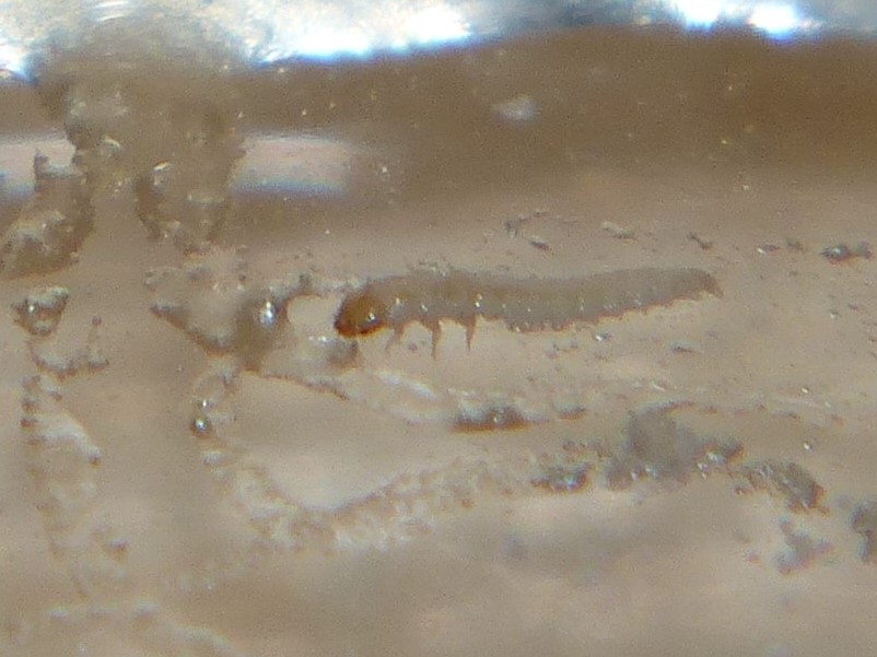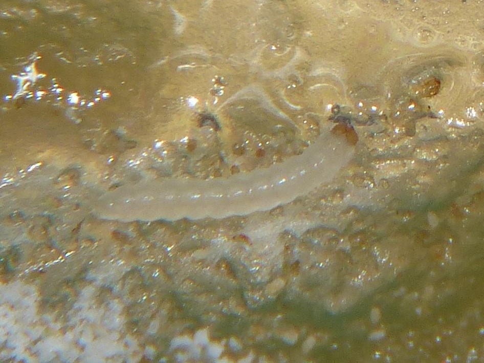 C'est très difficile de suivre l'évolution : la majorité des chenilles sont restées minuscules (2 mm environ) tandis que d'autres (j'en ai juste repéré deux) sont nettement plus grosses (5 mm ?) mais que l'on aperçoit juste dans des galeries creusées dans le mélange de nourriture à travers le verre du bocal... Du coup, il a certainement plusieurs stades, mais impossibles à photographier dans l'état actuel, sans risquer de les tuer...