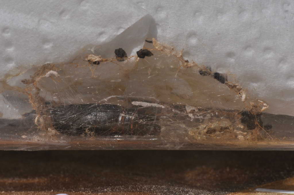 Et elle est maintenant sous ce papier où elle a commencer à tisser un cocon et ne bouge plus.. je suppose que j'aurai du mettre de la terre ou du sable... ?