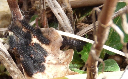 La plante hôte, Veronica spicata, a peine visible... Et voici déjà quelques chenilles de melitée cinxia en train de prendre un bain de soleil. Bien merité après le grand froid qu'on a eu!