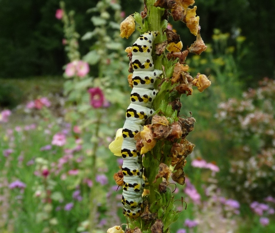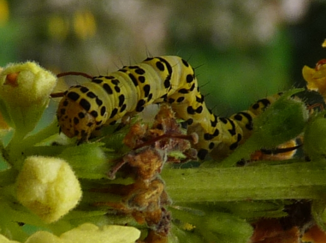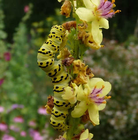 Là plante, Le Molène noir, s'est installée il y a quatre ans. C'est un vivace qui devient plus grand et plus beau tous les ans. En périodé de la floraison, voilà, elles reviennent... Les cucullies de la Molène... Les grandes et les petites en même temps. La photo est trompeuse car elles sont tellement bien camouflées qu'il faut bien observer pour les trouver ! Elles grandissent vite et quand le vent soufle fort, les petites chenilles tombent et retrouvent les fleurs par une file de soie...