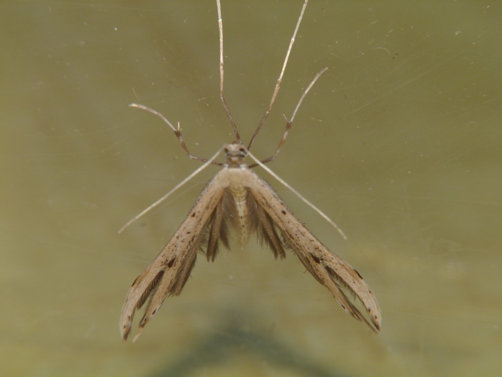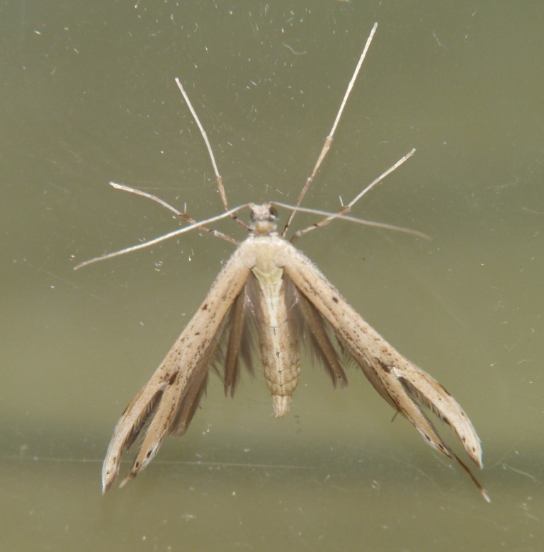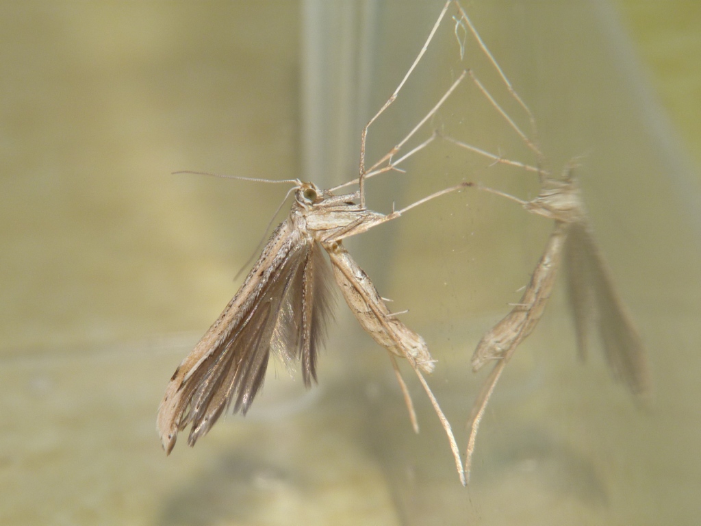 Émergence à l'instant de ce Ptérophore commun à partir d'une chrysalide fixée sur un mur, chez moi.