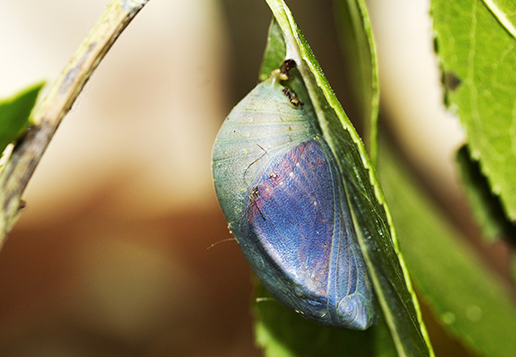 Voilà, sur trois chenilles une seule s'est nymphosée. Encore un jour, deux peut-être. Encore un peu de transparence à venir. J'espère être présent à l'ouverture.