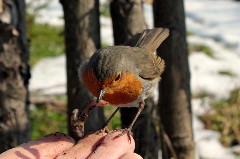 Ce rouge-gorge a apprécié. Venu sur ma main pour 1/10° de seconde; le temps du clic clac merci Kodak.