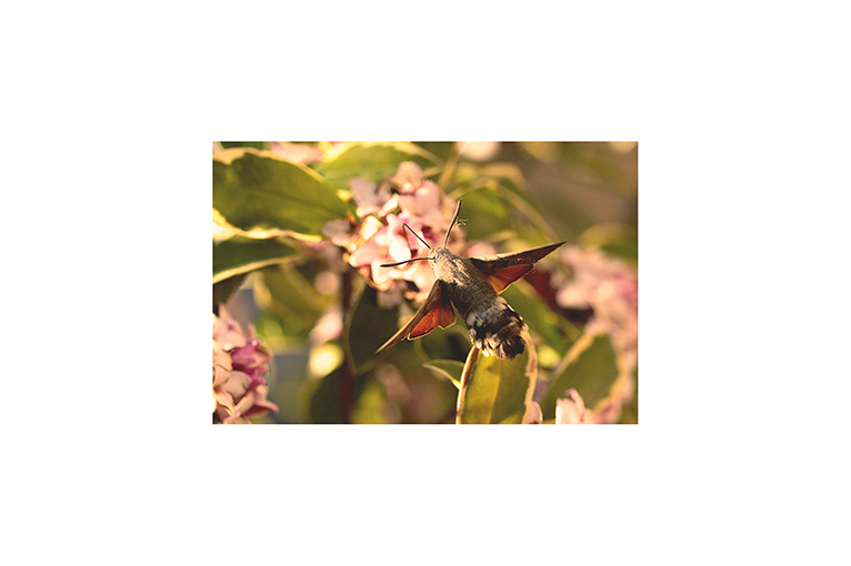 Ce Moro Sphinx est venu aujourd'hui avec un premier rayon de soleil, sur Daphné odorante. Bon augure?