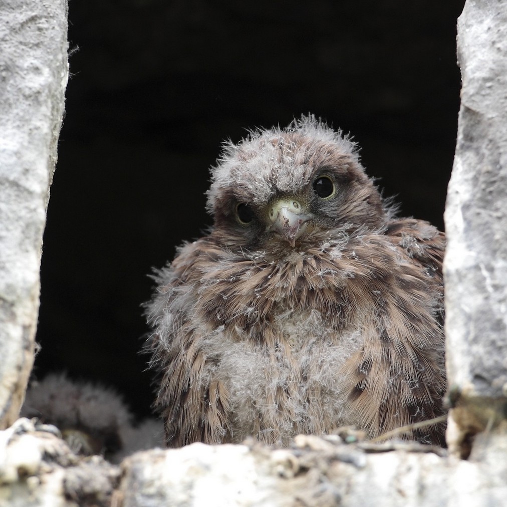 Merci pour elle - si tu regardes bien le faucon, d'étonnement ou de peur, a relâché ses sphincters durant cette rencontre de quelques instants (ceci est moins poétique). Derrière le mur avec le nid, il y a encore plusieurs nids d'hirondelles de cheminée (grange) + nid de chouettes effraies dans le grenier (au-dessus de la porte où se trouve le faucon).