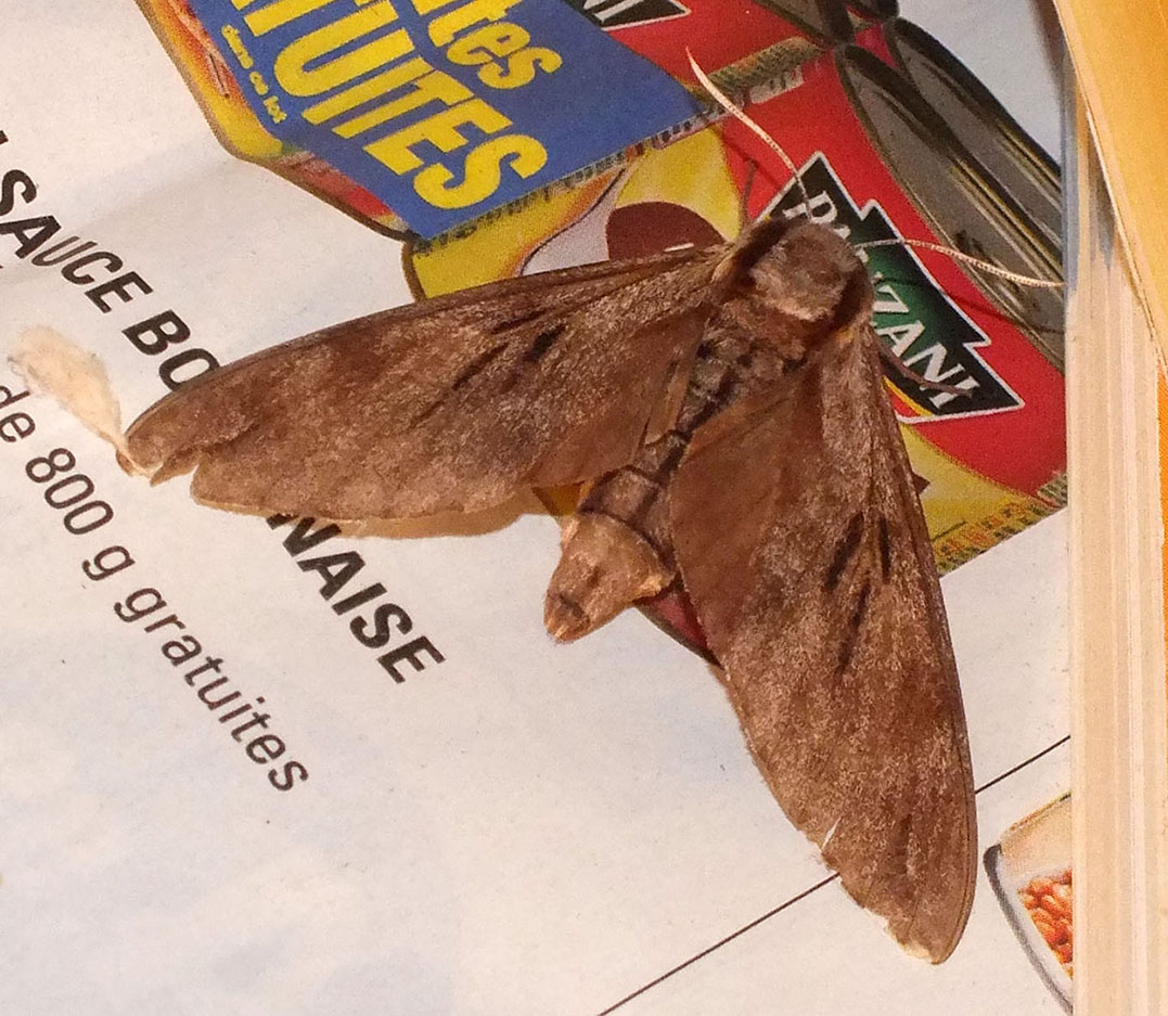 Un Sphinx du pin entré à la cuisine. Avec son vol puissant cela fait l'effet d'une intrusion de petit oiseau comme la mésange bleue.