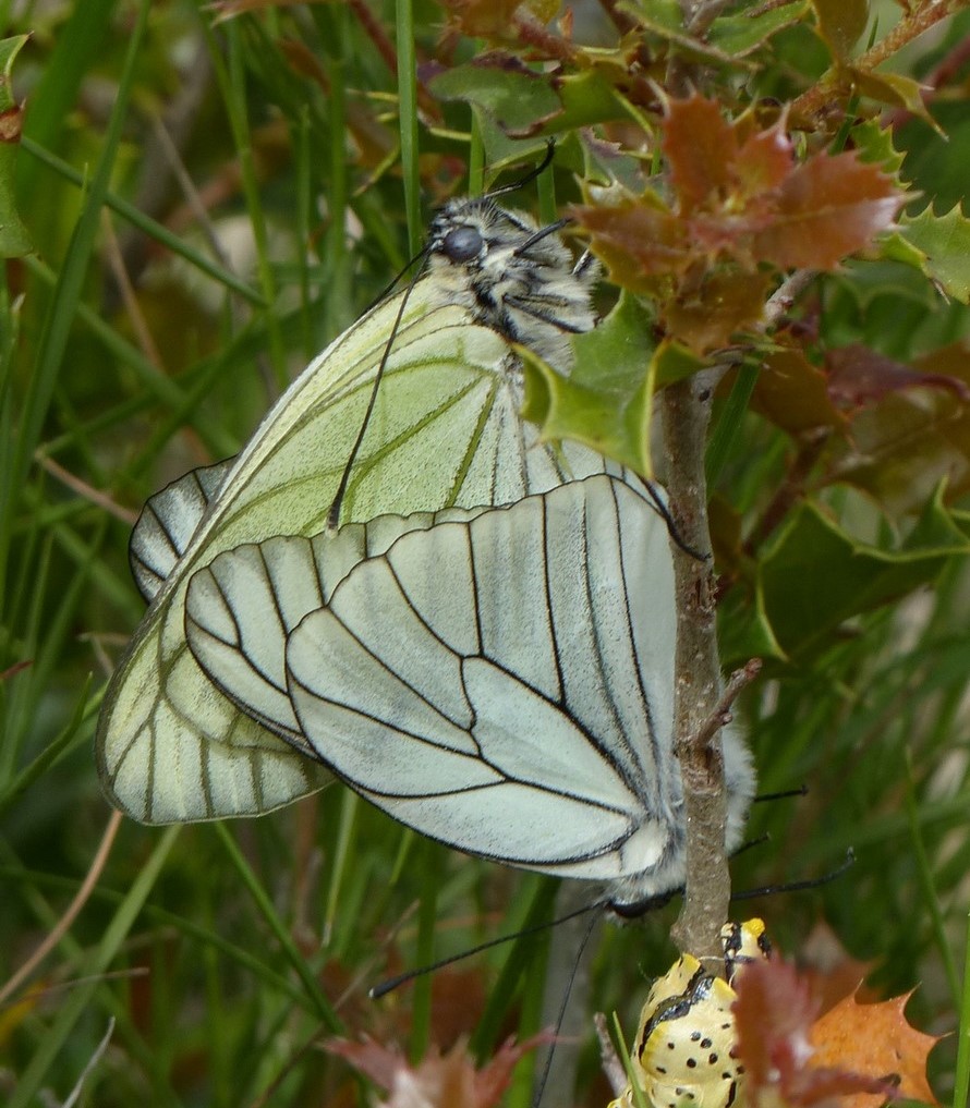 On voit que l'accouplement s'est produit dès que la femelle a émergé de la chrysalide (exuvie en dessous du couple)...