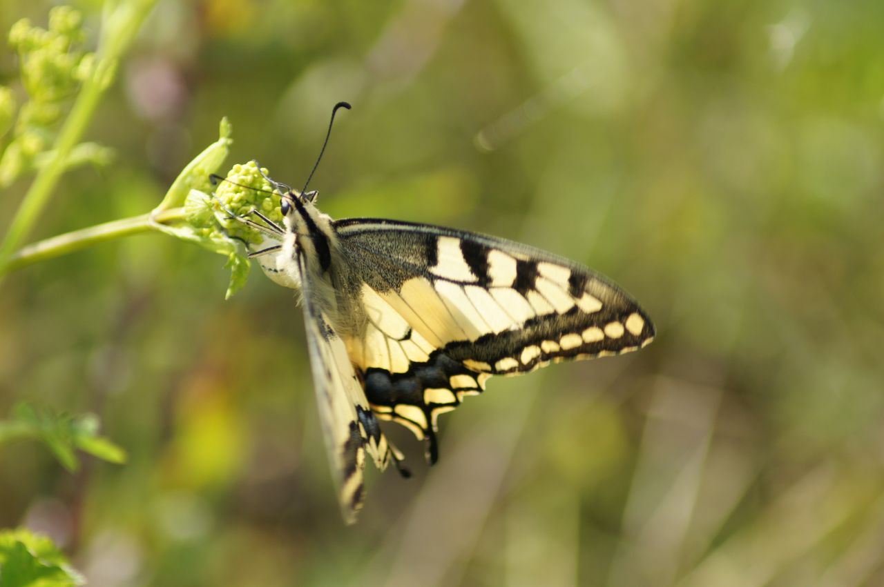 Ce machaon volait de plante en plante et à chaque fois il courbait son abdomen vers la plante surtout que celle-ci n'est pas en fleur.