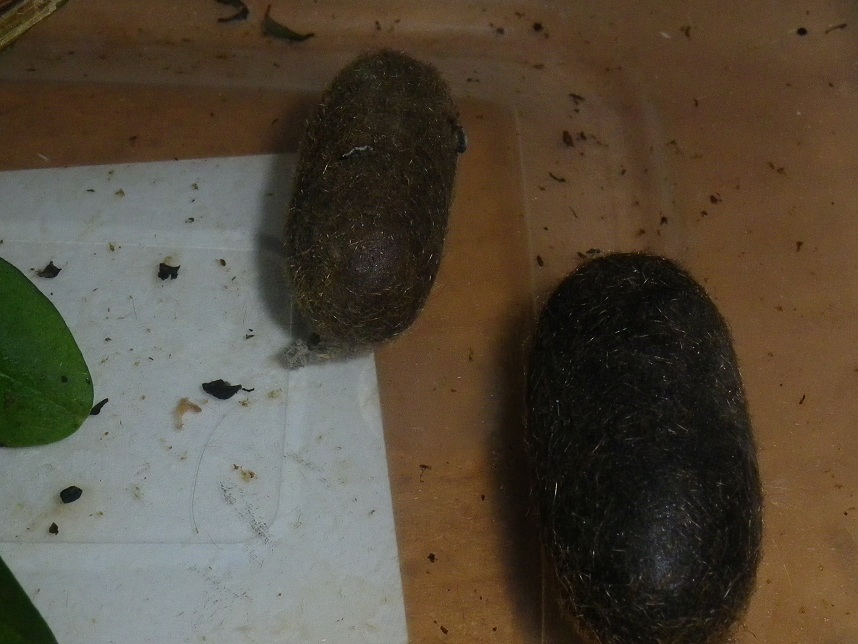 Cocons issus de mon élevage. On note une différence de taille, il s'agit surement d'un couple.