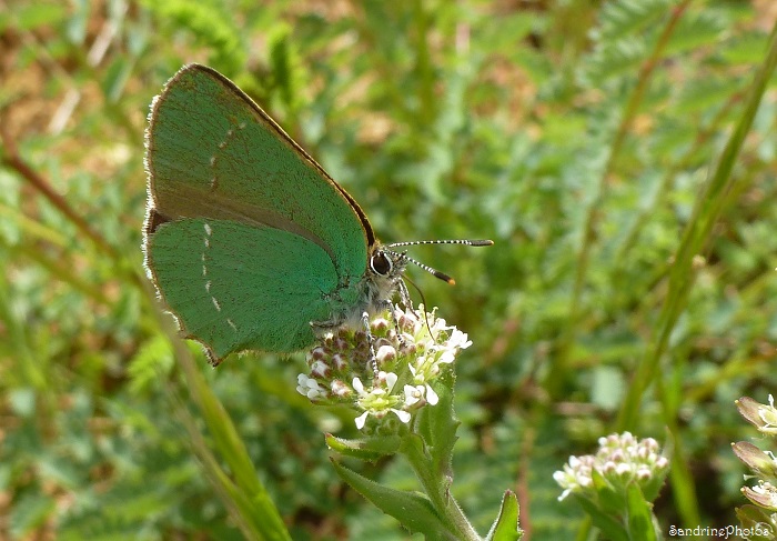 Argus vert sur Passerage champêtre, Callophrys rubi, Thécla de la Ronce, Bouresse, Poitou-Charentes, le 17 Mai 2013.jpg