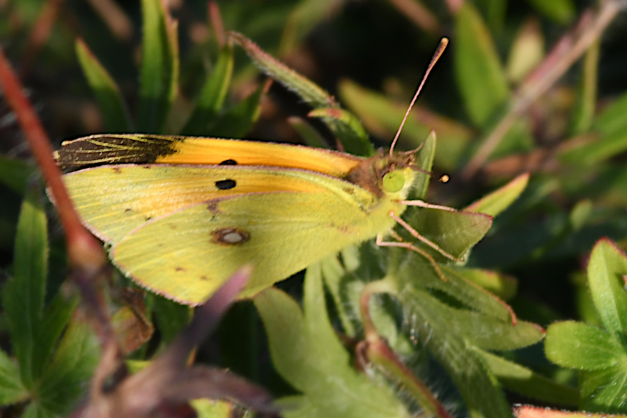 Il y a plusieurs papillons jaunes qui se ressemblent, alors j'ai un souci pour le nommer. Heureusement, on aperçoit la face supérieure d'une aile, ce qui peut aider.