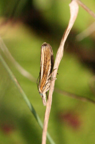 J'ai photographié (pas très nettement, à la va-vite avant qu'il ne disparaisse) ce midi, sur une friche à Herstal/Belgique, ce petit Crambidae. Il devrait s'agir de Agriphila latistria, sans absolue certitude (je n'ai pas eu le temps de fixer l'objectif sur les détails).