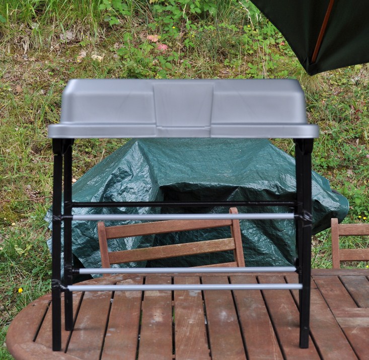 2 : les prici paux composants : de gauche a droite : le bac , la lampe (eco 100watts ) montée sur un pied de lampadaire , avec une rallonge de 10metres , le couvercle , les 2 planches en contre plaquée ,
